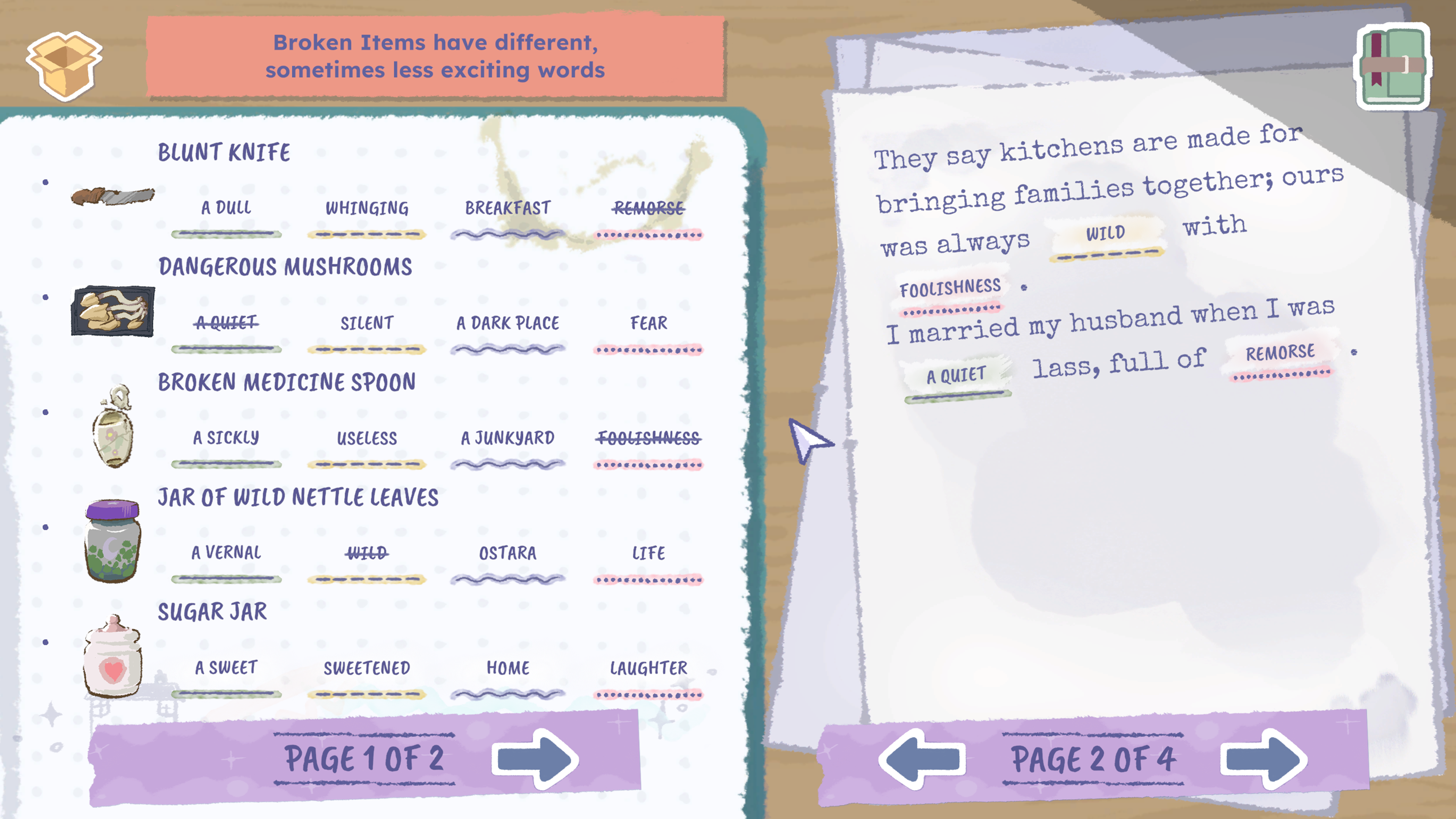 A Storied Life: Tabitha takes you to Lavender Laithe, the former home of Tabitha, a recently-deceased loved one. Upon arriving, you discover that Tabitha has an agreement with a publisher to print her memoirs... which have just been damaged due to an unfortunate mishap. It’s up to you to go through the house and piece together Tabitha’s life, filling in the gaps left in her memoir pages using the items you find along the way to guide you.